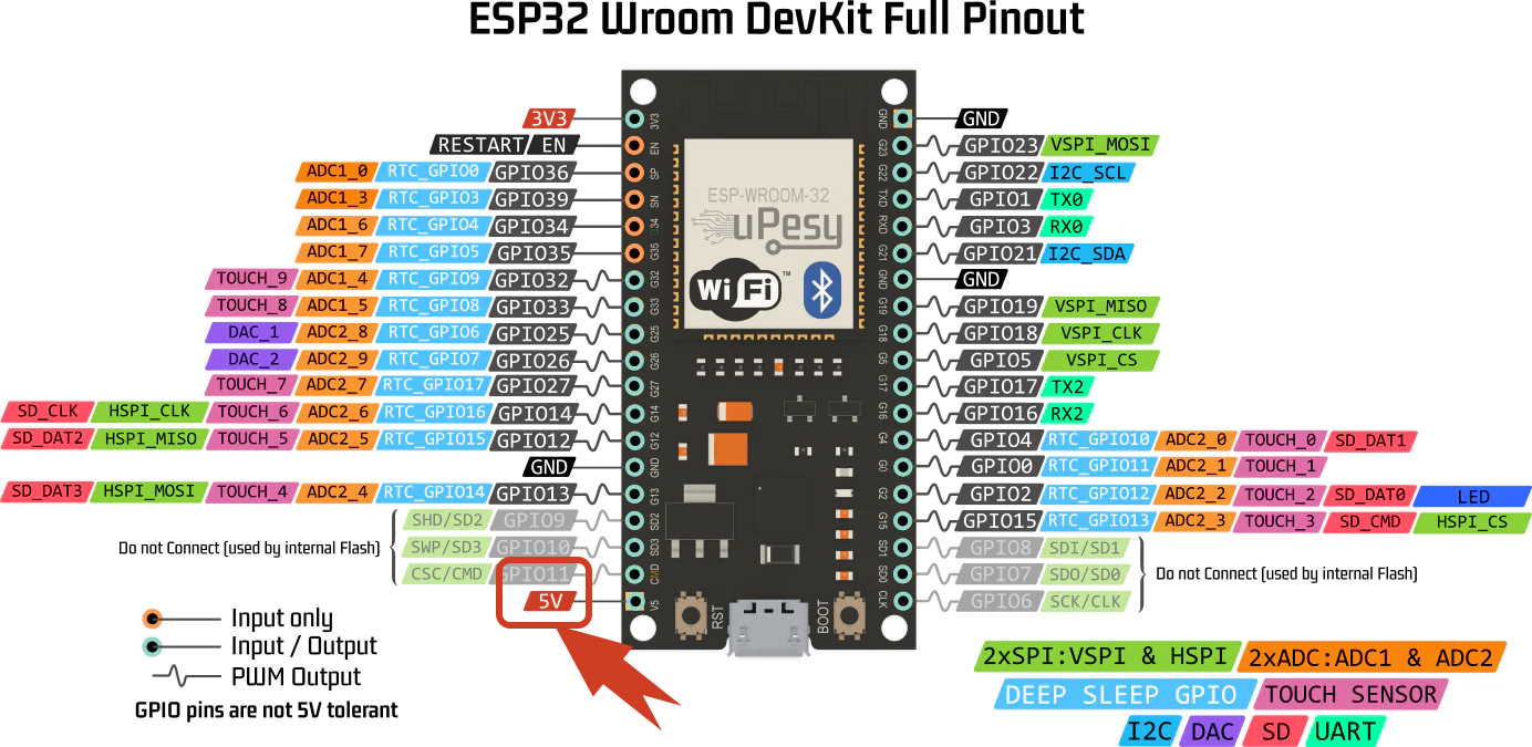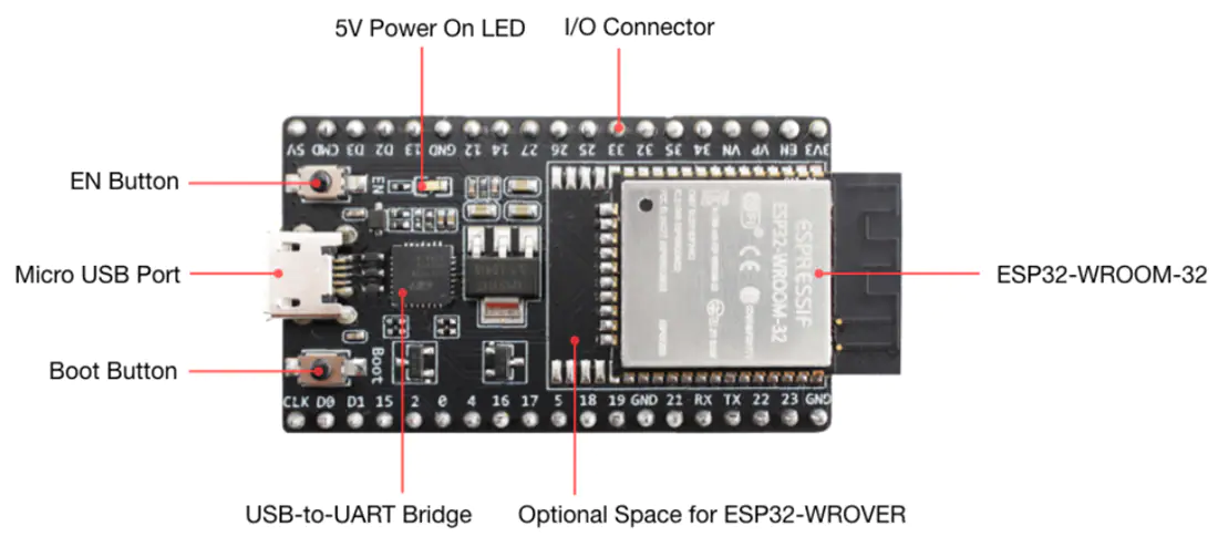 | 5 | GPIO Pins | GPIO0 to GPIO39 | Can be used as Input/Output pins, LOW -> 0V , HIGH -> 3.3V, Pins GPIO34 - GPIO39 Input only |